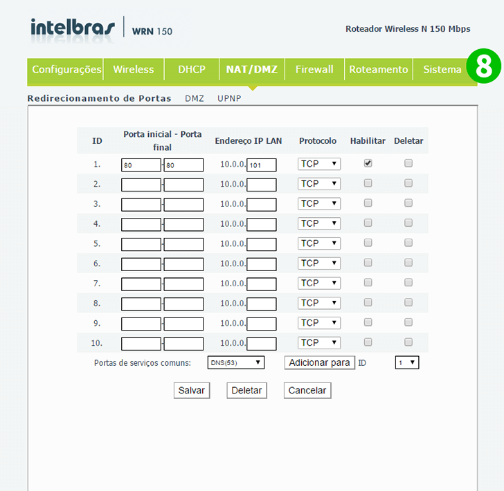 5 У доњем делу погледајте „ Portas de serviços comuns “ (Цоммон сервице порт) и кликните на десно поље и изаберите „ HTTP (80) “